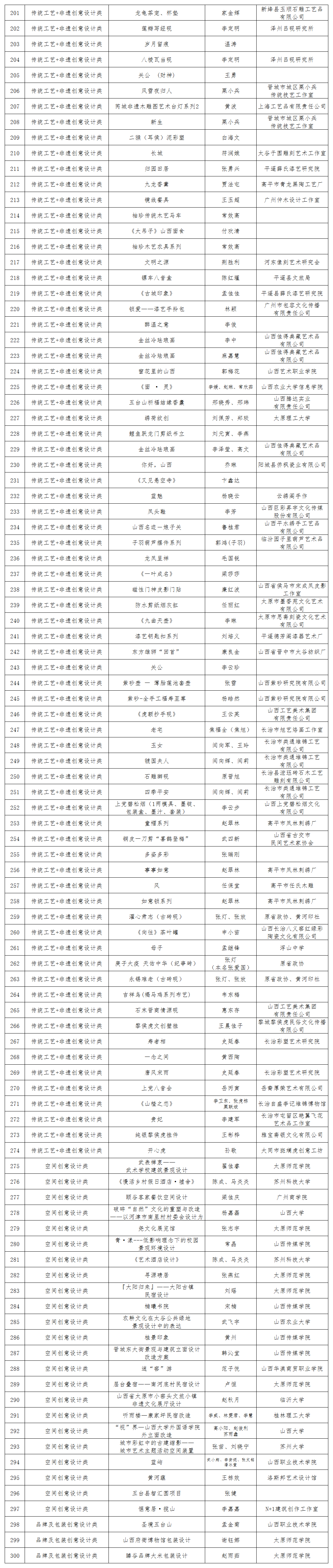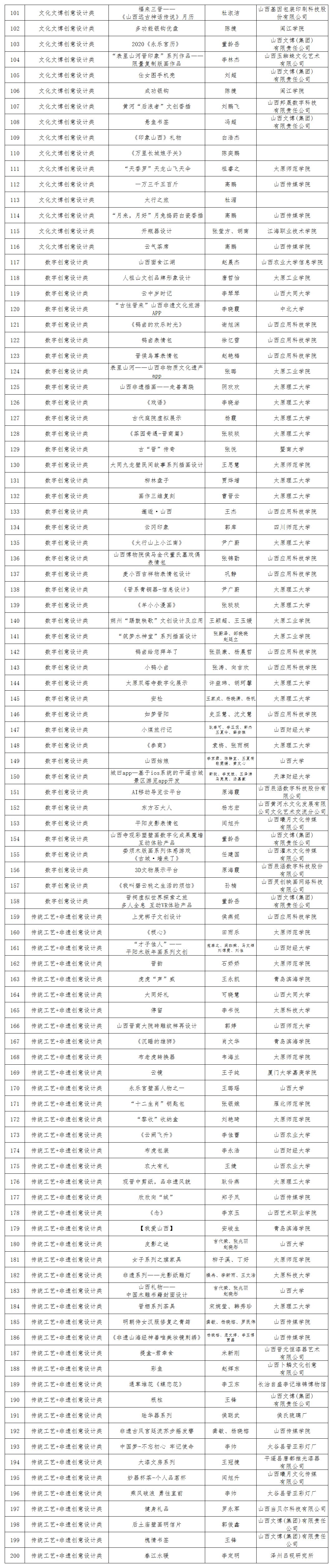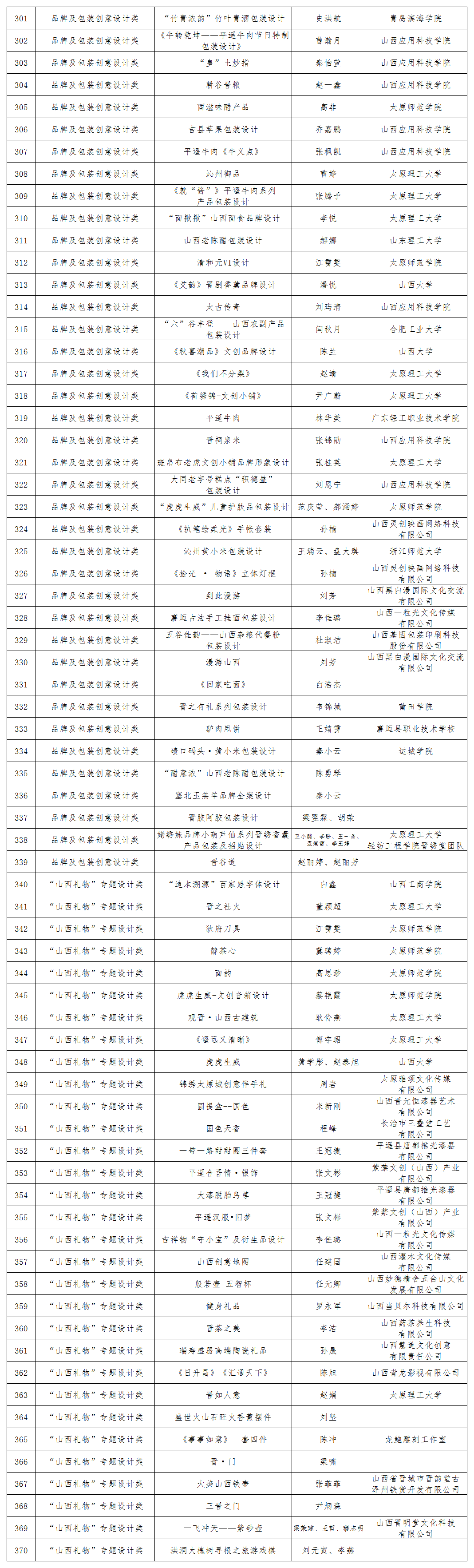 第二屆山西省文化創(chuàng)意設(shè)計大賽組委會組織專家依據(jù)公平、公正、公開的原則,從主題性、創(chuàng)新性、市場性、實用性、文化性、藝術(shù)審美性、工藝性、環(huán)保性等維度對作品進行評審,最終評出370件入圍作品,現(xiàn)將名單公布如下: