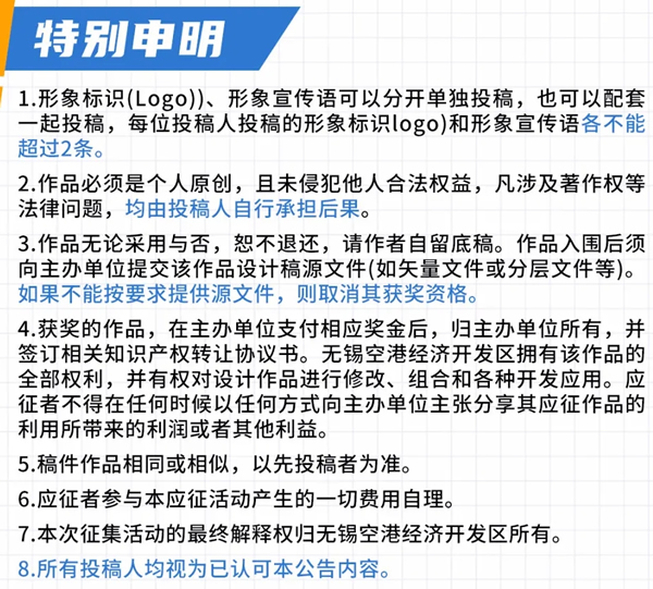 3.投稿作品以“無錫空港經(jīng)濟(jì)開發(fā)區(qū)形象標(biāo)識(shí)(Logo)征集+姓名”“無錫空港經(jīng)濟(jì)開發(fā)區(qū)形象宣傳語征集+姓名”為郵件標(biāo)題發(fā)送電子郵件至kgxcb@126.com,咨詢電話:0510-85307722。