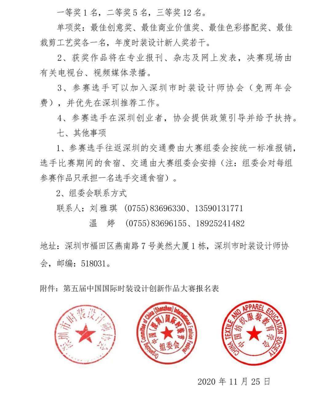 3、經(jīng)組委會審核,參賽名單將在中國紡織服裝教育學(xué)會官網(wǎng)http://www.ctes. cn/、深圳市時裝設(shè)計師協(xié)會官網(wǎng)http://www. szfda net/公布。