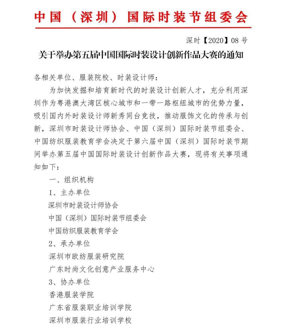 為加快發(fā)據(jù)和培育新時代的時裝設(shè)計創(chuàng)新人才,充分利用深圳作為粵港澳大灣區(qū)核心城市和一帶一路樞紐城市的優(yōu)勢力量,吸引國內(nèi)外時裝設(shè)計師新秀同臺競技,推動服飾文化的傳承與創(chuàng)新,深圳市時裝設(shè)計師協(xié)會、中國(深圳)國際時裝節(jié)組委會、中國紡織服裝教育學(xué)會決定于第六屆中國(深圳)國際時裝節(jié)期間舉辦第五屆中國國際時裝設(shè)計創(chuàng)新作品大賽,現(xiàn)將有關(guān)事項通知如下: