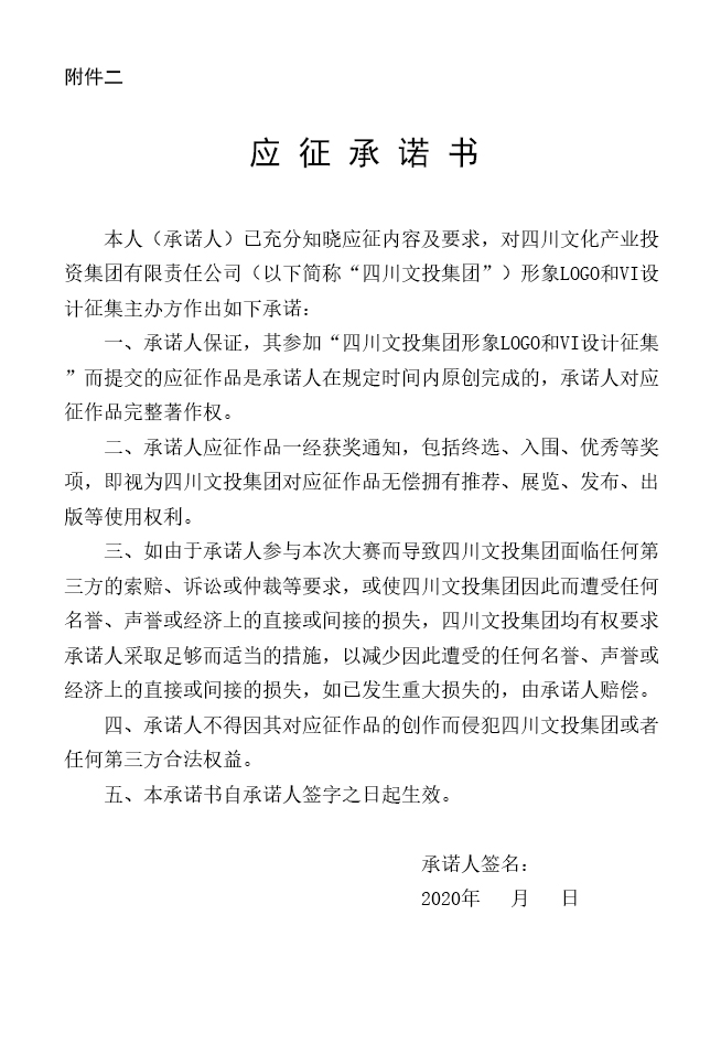 4. 投稿者須提供四川文投集團(tuán)VI作品征集《應(yīng)征承諾書》(附件二)。