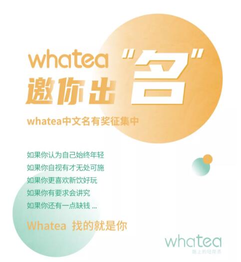 一個輕簡、且有品質(zhì)不將就的茶品牌 將聚集更多的人 一起創(chuàng)造、分享并樂飲其中 同時也希望更多人能參與whatea茶品牌的成長 我們愿意將更好的創(chuàng)意 更有趣更重要的事 留給大家 同時也愿意回報更好的茶 更實在的現(xiàn)金獎勵 若你愿開動大腦 為whatea中文名獻(xiàn)出一點點的智慧 我們將不甚榮幸