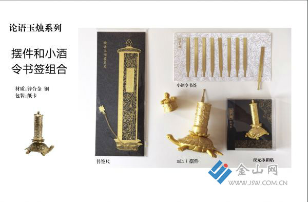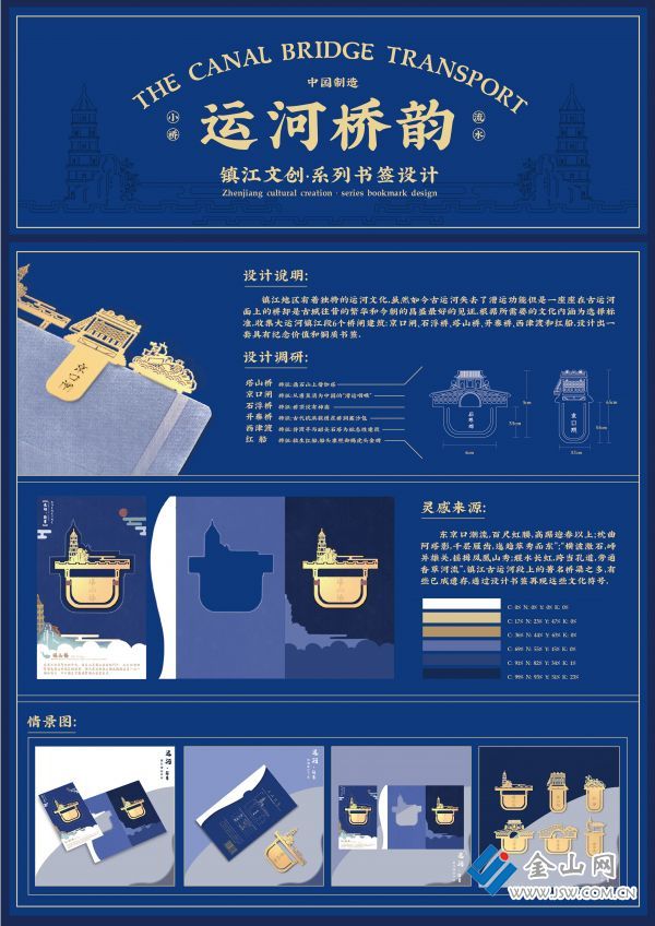 本次賽事等級(jí)獎(jiǎng)特別是“十佳‘最鎮(zhèn)江’文創(chuàng)設(shè)計(jì)獎(jiǎng)”獲獎(jiǎng)作品,充分挖掘鎮(zhèn)江香醋、金山、泥叫叫、大運(yùn)河等各類鎮(zhèn)江地域文化,融入現(xiàn)代年輕元素,設(shè)計(jì)新穎、貼近生活。其中,“金山獎(jiǎng)(金獎(jiǎng))”獲獎(jiǎng)作品《<運(yùn)河橋韻>系列書簽設(shè)計(jì)》收集京口閘、石浮橋、西津渡和紅船等大運(yùn)河鎮(zhèn)江段6個(gè)橋閘建筑,設(shè)計(jì)一套具有紀(jì)念價(jià)值的銅質(zhì)書簽。《百年恒順廿一精釀》抓住恒順老字號(hào)的歷史傳承,用插畫的形式描繪細(xì)心耕耘的工藝流程,結(jié)合時(shí)下流行的國(guó)風(fēng)畫風(fēng),定制年輕化包裝設(shè)計(jì)?!般y山獎(jiǎng)(銀獎(jiǎng))”獲獎(jiǎng)作品《鎮(zhèn)江五山系列-五福迎樽》通過中國(guó)五福文化(福祿壽喜財(cái))對(duì)應(yīng)鎮(zhèn)江五座名山(茅山-福,焦山-祿,南山-壽,北固山-禧,金山-財(cái)),以五福迎樽制作年禮。“十佳‘最鎮(zhèn)江’文創(chuàng)設(shè)計(jì)獎(jiǎng)”獲獎(jiǎng)作品《萬(wàn)善茶器》,以丹陽(yáng)“古運(yùn)河畔第一塔”的萬(wàn)善塔為靈感制作茶器,把手取用“萬(wàn)”字,壺蓋頂尖采用萬(wàn)善塔剪影形象,茶杯運(yùn)用塔身八角造型,整套茶器體現(xiàn)“萬(wàn)物皆善”的處事理念。