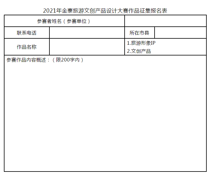 附:2021年金寨旅游文創(chuàng)產(chǎn)品設計大賽作品征集報名表