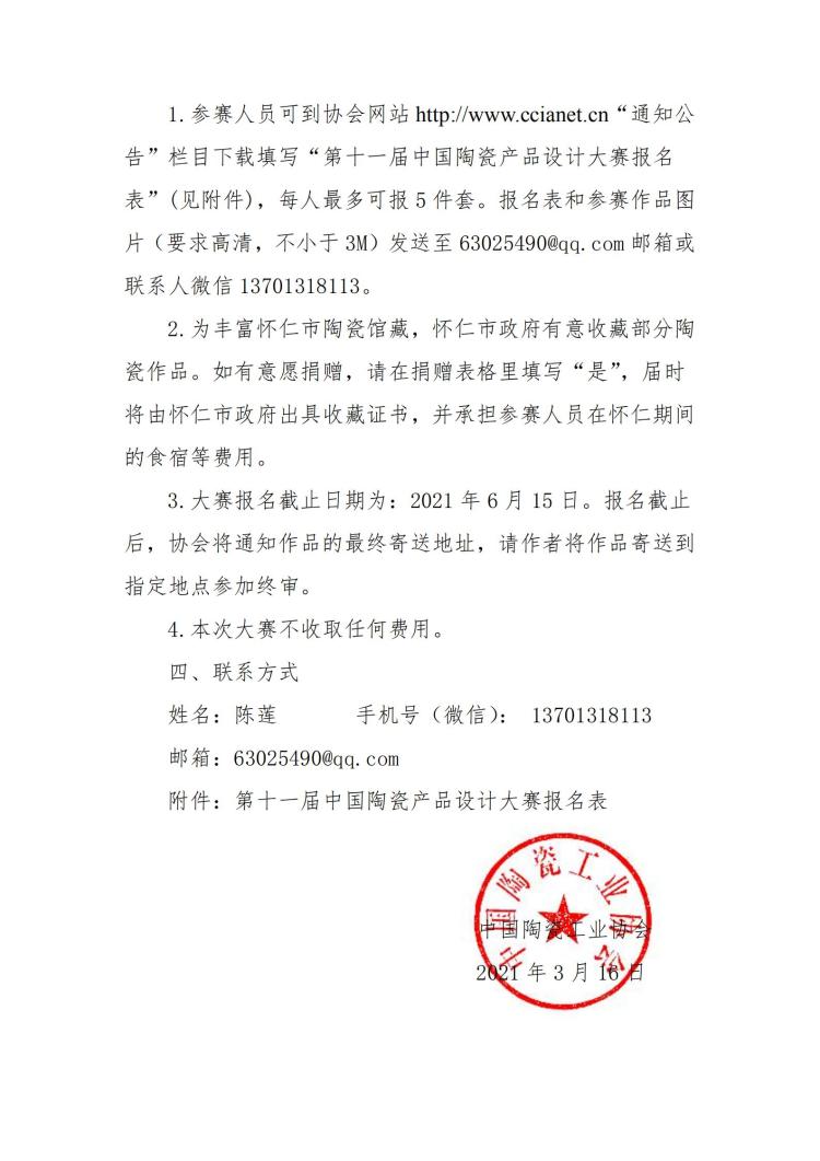 三、參賽方式1.參賽人員可到協(xié)會(huì)網(wǎng)站 http://www.ccianet.cn“通知公告”欄目下載填寫“第十一屆中國(guó)陶瓷產(chǎn)品設(shè)計(jì)大賽報(bào)名表”(見(jiàn)附件),每人最多可報(bào) 5 件套。報(bào)名表和參賽作品圖片(要求高清,不小于 3M)發(fā)送至 63025490@qq.com 郵箱或聯(lián)系人微信 13701318113。