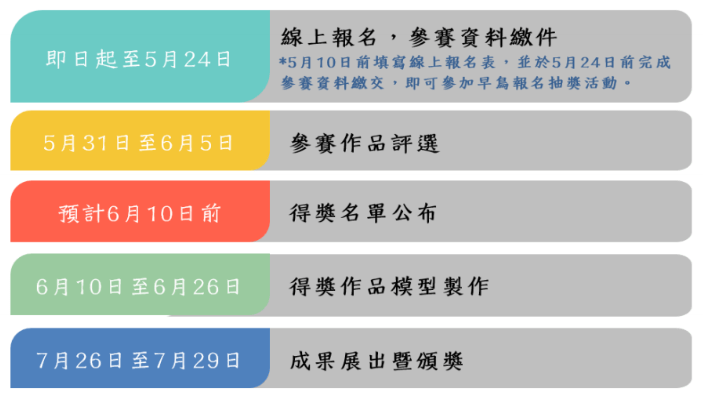 *早鳥(niǎo)報(bào)名抽獎(jiǎng)活動(dòng) | 于 108 年 5 月 10 日前至活動(dòng)官網(wǎng)填寫(xiě)在線(xiàn)報(bào)名表,并于 108 年 5 月 24 日前完成參賽資料繳交 (在線(xiàn)繳件,以及裱板與作品設(shè)計(jì)說(shuō)明寄送)之各主題前 30 名參賽者,將可參加早鳥(niǎo)報(bào)名抽獎(jiǎng)活動(dòng)。 | |