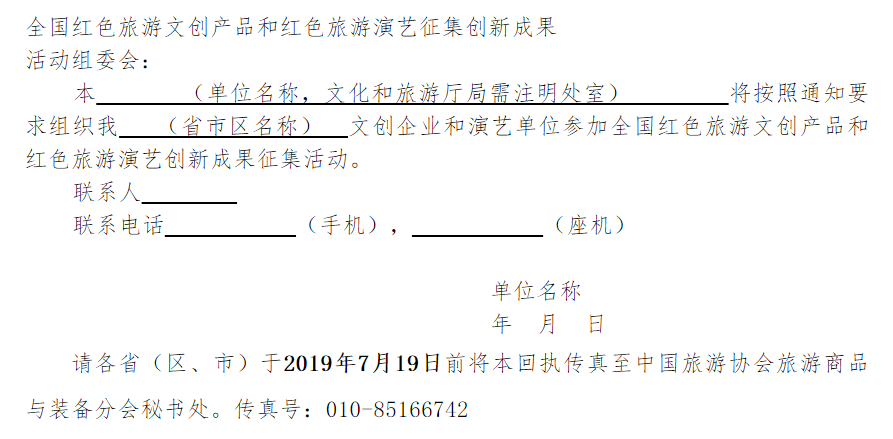 (1)請各省(區(qū)、市)于2019年7月19日前將組織參征回執(zhí)(附件4)傳真至中國旅游協(xié)會旅游商品與裝備分會秘書處。傳真號:010-85166742
