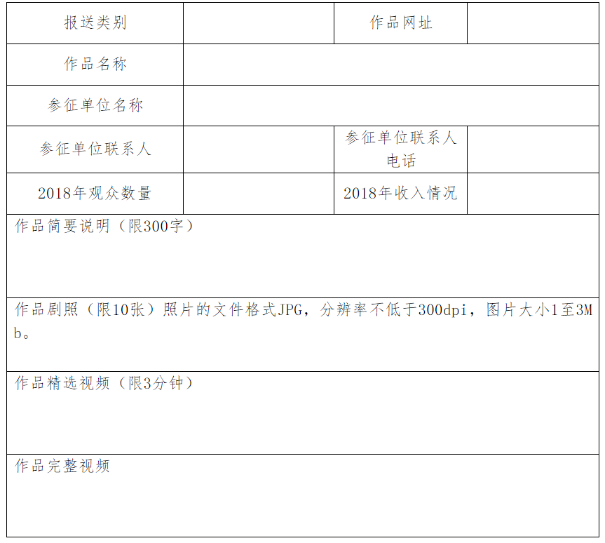 6、全國紅色旅游文創(chuàng)產(chǎn)品和紅色旅游演藝創(chuàng)新成果征集活動(dòng)報(bào)名內(nèi)容表(演藝作品)