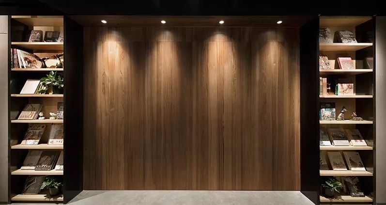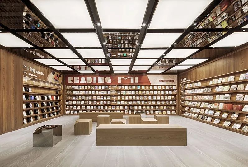 為了突出書房的觀感和儀式感,設(shè)計(jì)師將書房做了抬高,人們拾級(jí)而上,進(jìn)入知識(shí)的世界,書房天花的鏡面吊頂蔓延至?xí)客?,象征知識(shí)和力量向外發(fā)散。在不大的店內(nèi),級(jí)差為空間帶來(lái)了更好的節(jié)奏感,而進(jìn)入書房后視角的切換,也為人們帶來(lái)了更為奇妙的感受。