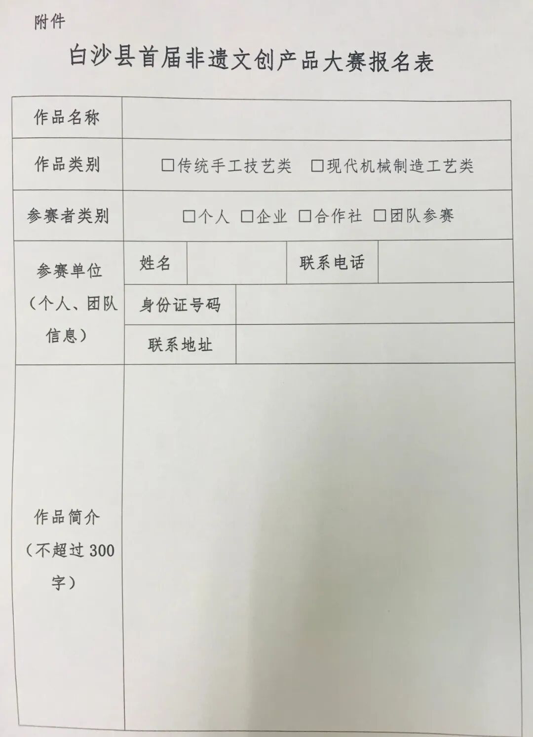 1.參賽人員必須如實(shí)填寫《白沙縣首屆非遺文創(chuàng)產(chǎn)品大賽報(bào)名表》,提交至縣文化館辦公室,或者發(fā)送至郵箱baishawhg472@163.com,信息錯(cuò)填或未填寫聯(lián)系方式導(dǎo)致無法聯(lián)絡(luò)的,責(zé)任由參賽者自行承擔(dān)。