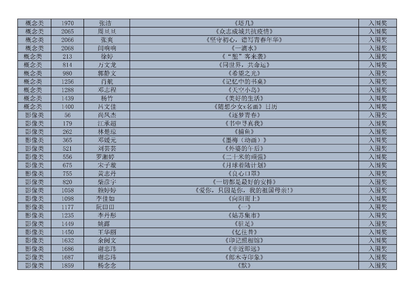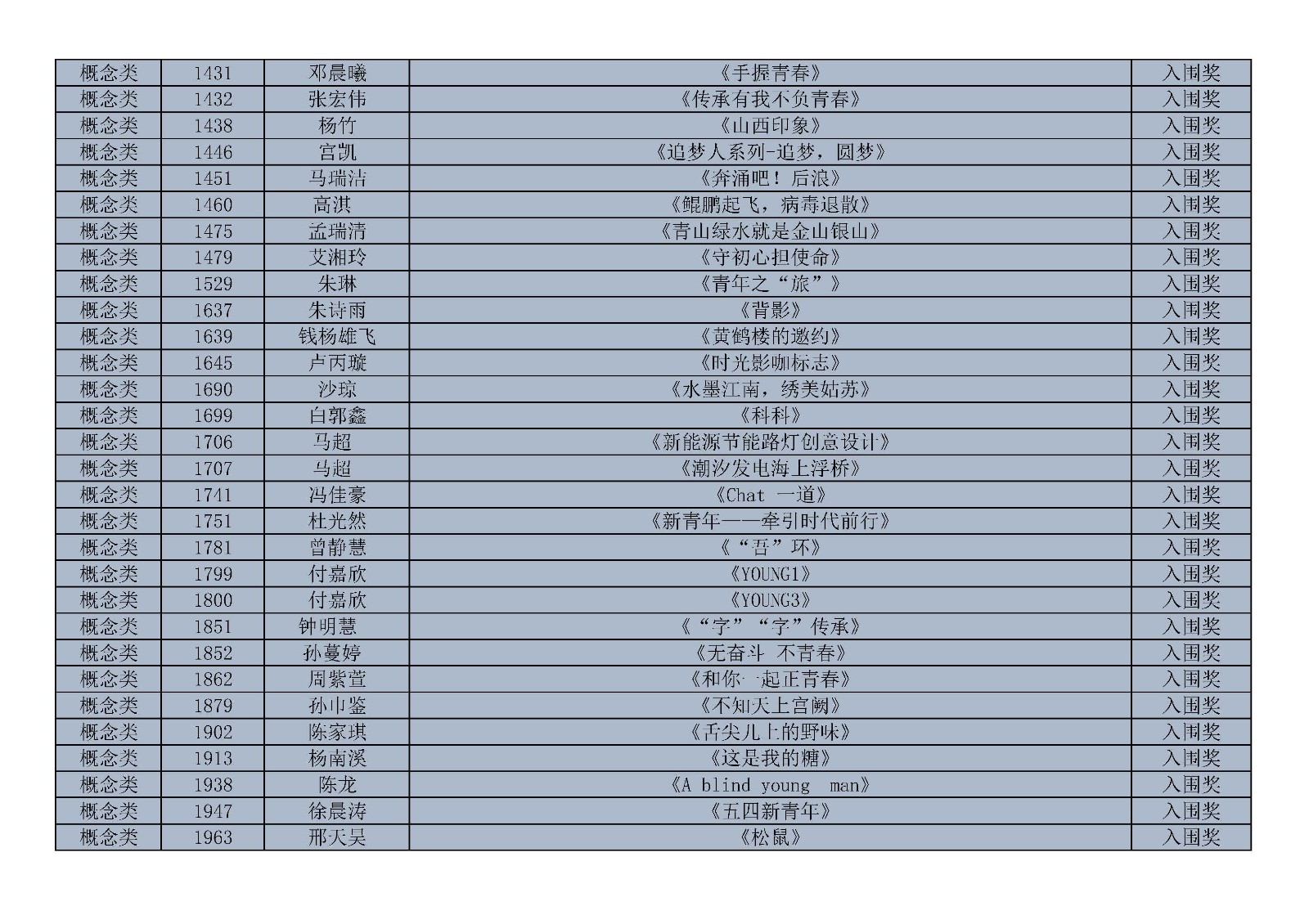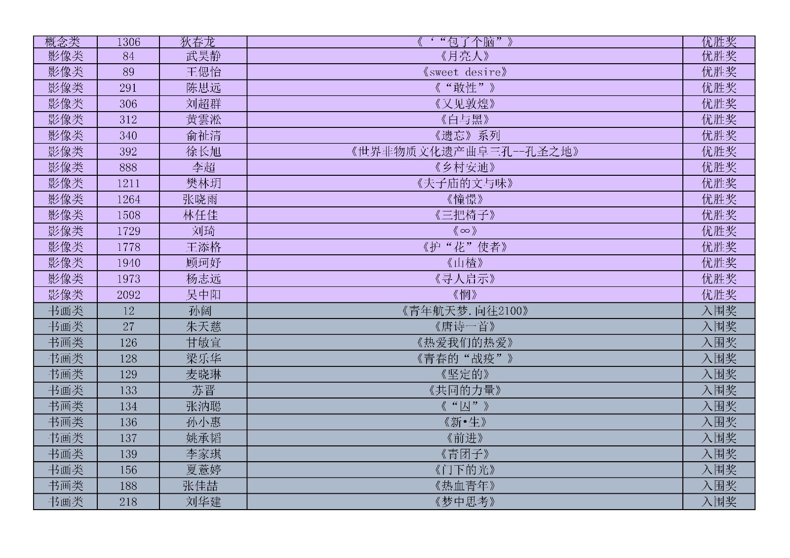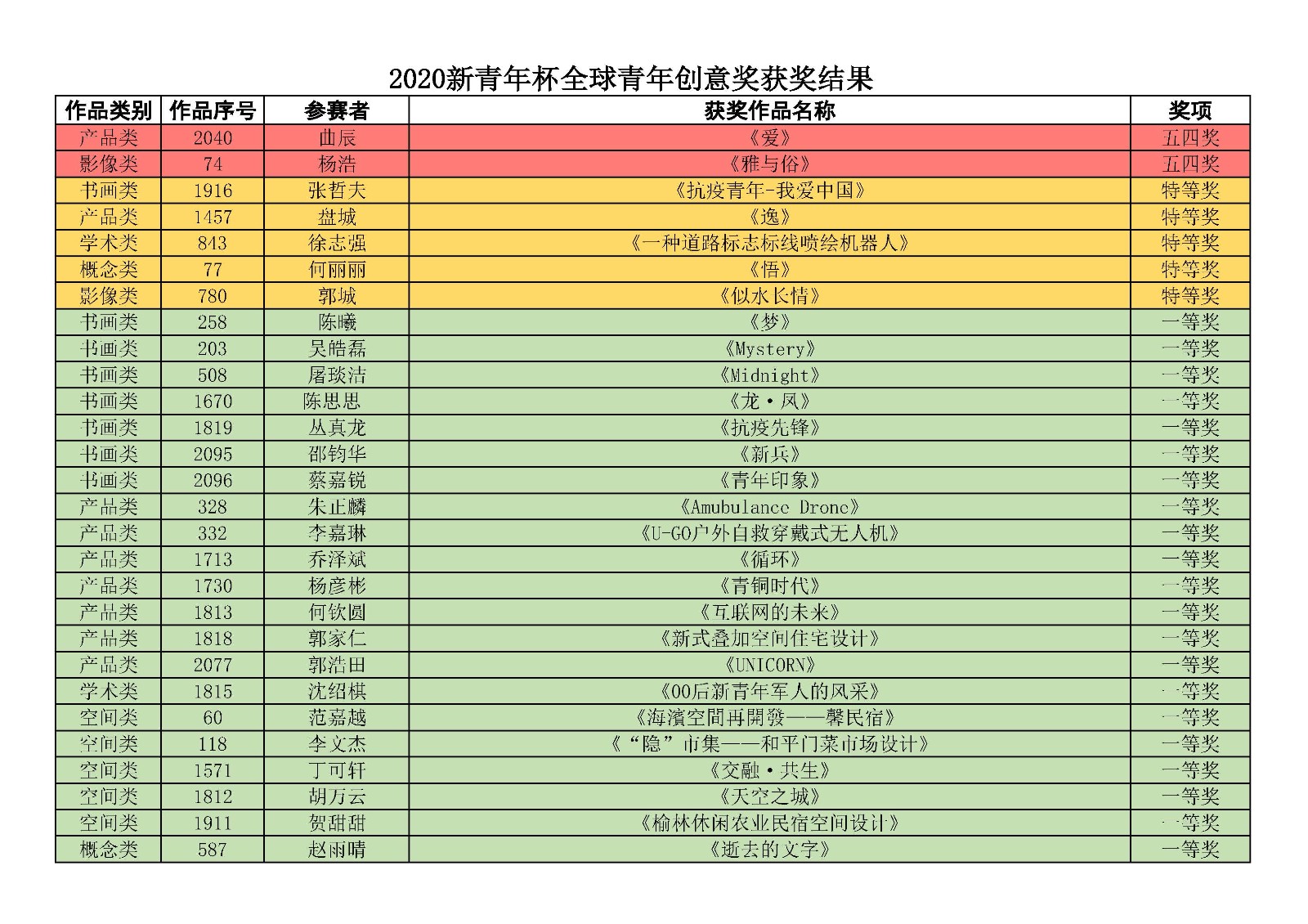 2020新青年杯全球青年創(chuàng)意獎(青年杯)共計收到參賽稿件10021件,通過第一輪初賽,共計2087件作品入圍。截止6月18日,共計收到復(fù)賽提交稿件1089件,本著公平、公正、公開的原則,現(xiàn)評選出五四青年創(chuàng)意獎2件、特等獎5件、一等獎、二等獎、三等獎、優(yōu)勝獎、入圍獎等若干項經(jīng)過為期3天的查詢公示,現(xiàn)將最終獲獎結(jié)果公布。