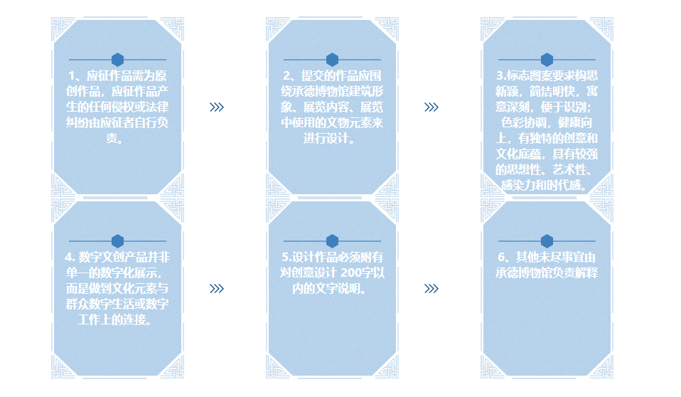 3、作品創(chuàng)作主題符合相關(guān)要求認(rèn)定:依托館藏資源、形象品牌、陳列展品,圍繞承德博物館建筑形象、展覽內(nèi)容、展覽中使用的文物元素來(lái)進(jìn)行設(shè)計(jì),征集具有原創(chuàng)性、引領(lǐng)性、有承德特色的精品文創(chuàng)設(shè)計(jì)作品。不得與當(dāng)下市場(chǎng)中的產(chǎn)品同質(zhì)化,不得抄襲和復(fù)制。