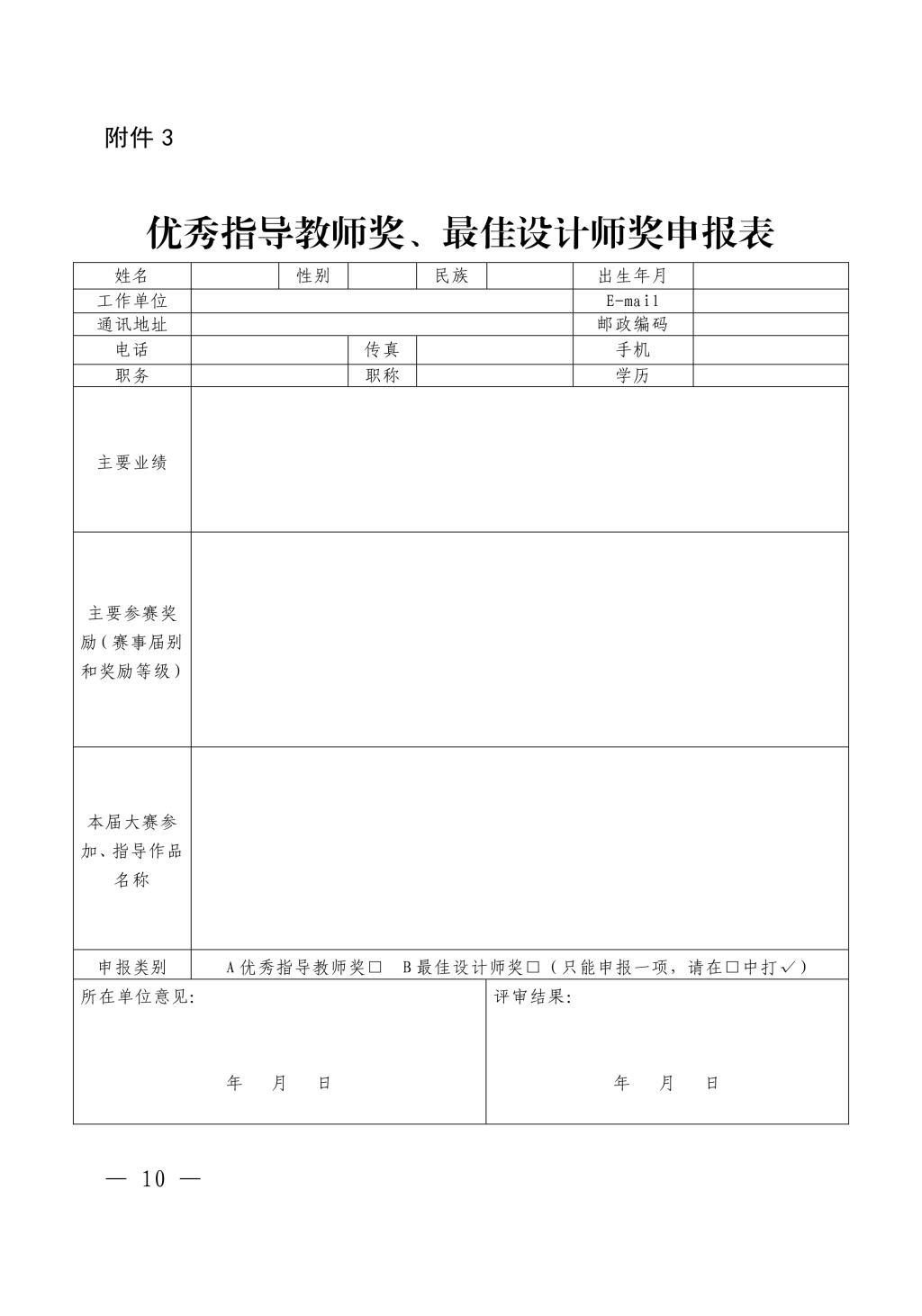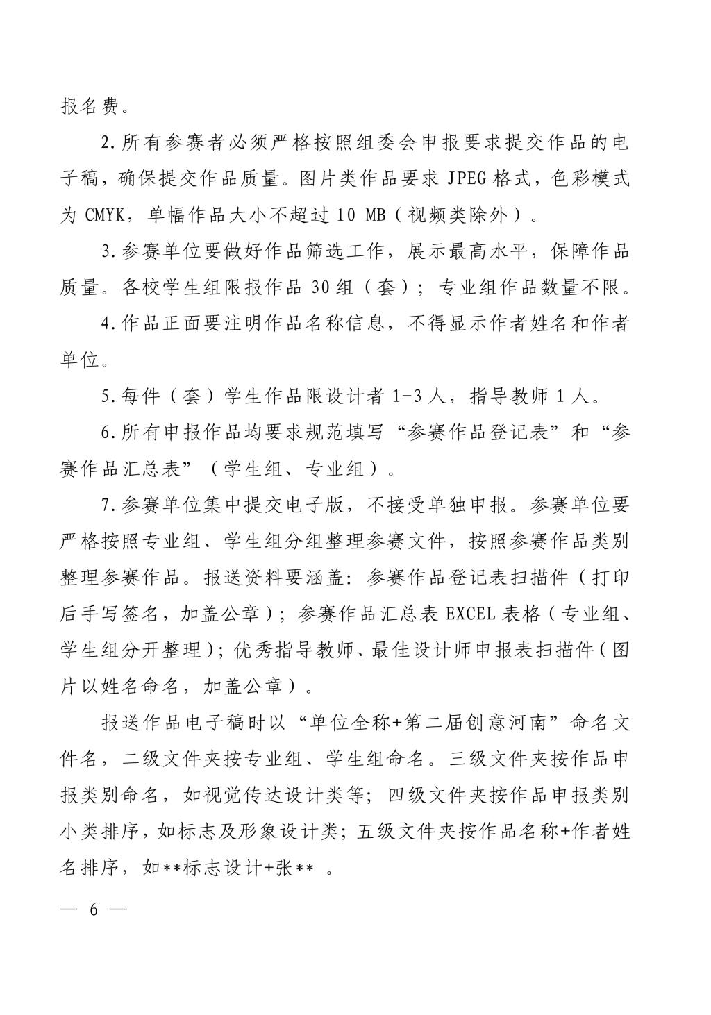 7.參賽單位集中提交電子版,不接受單獨(dú)申報。參賽單位要嚴(yán)格按照專業(yè)組、學(xué)生組分組整理參賽文件,按照參賽作品類別整理參賽作品。報送資料要涵蓋:參賽作品登記表掃描件(打印后手寫簽名,加蓋公章);參賽作品匯總表 EXCEL 表格(專業(yè)組、學(xué)生組分開整理);優(yōu)秀指導(dǎo)教師、最佳設(shè)計師申報表掃描件(圖片以姓名命名,加蓋公章)。