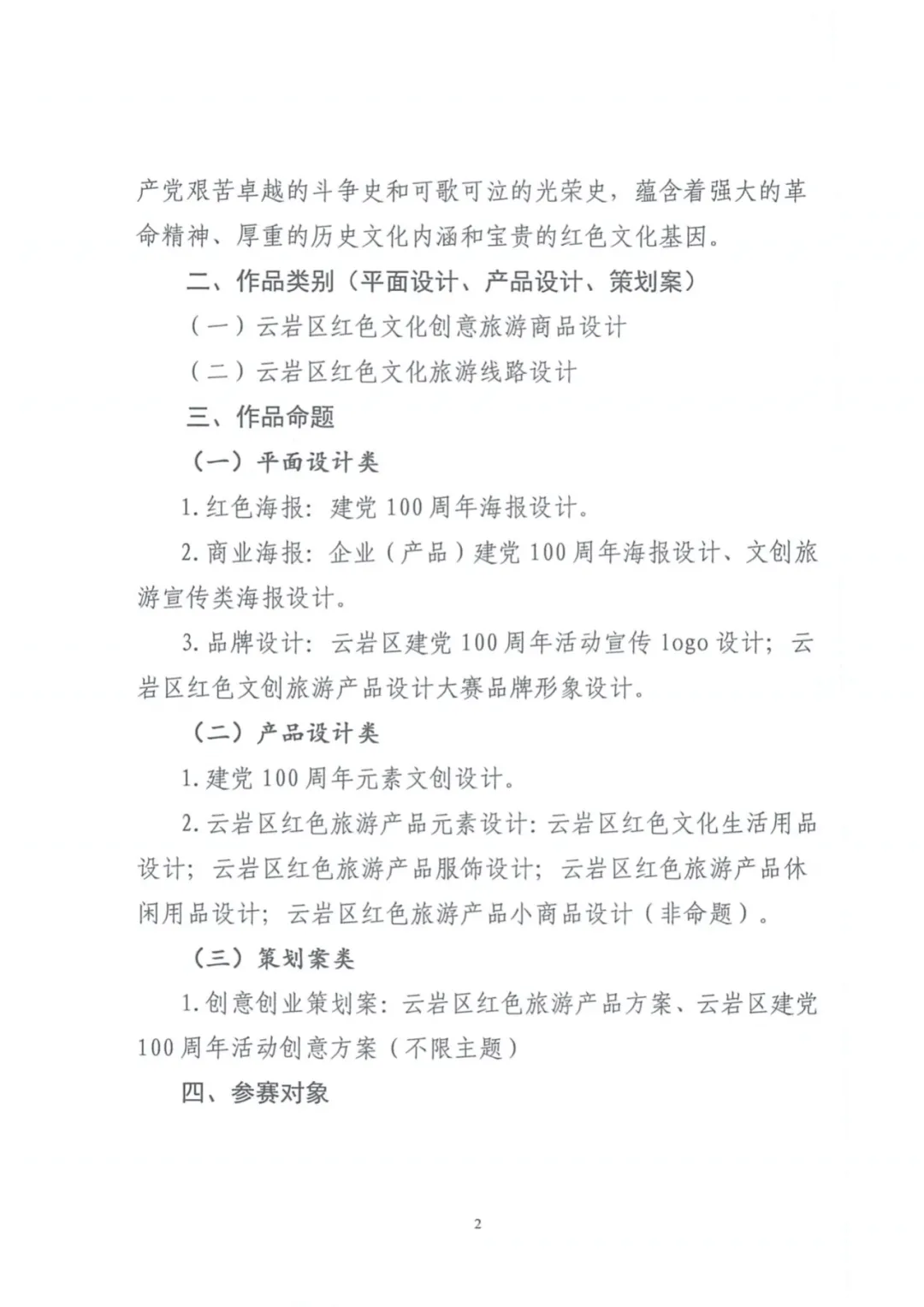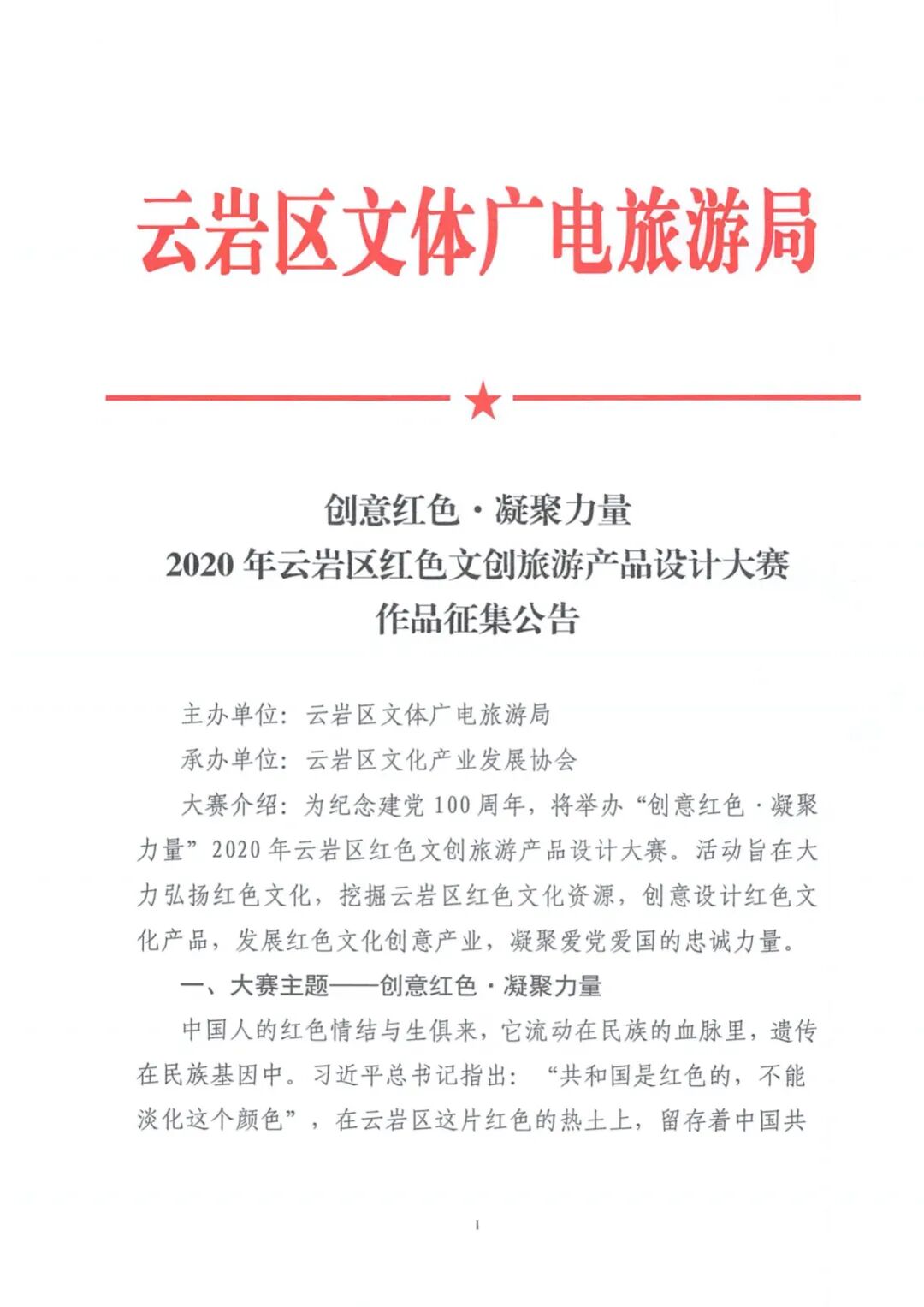 2020年云巖區(qū)紅色文創(chuàng)旅游產品設計大賽2021年是中國共產黨成立100周年。云巖區(qū)委區(qū)政府為紀念建黨100周年,將舉辦“創(chuàng)意紅色·凝聚力量”2020年云巖區(qū)紅色文創(chuàng)旅游產品設計大賽?;顒又荚诖罅霌P紅色文化,挖掘云巖區(qū)紅色文化資源,創(chuàng)意設計紅色文化產品,發(fā)展紅色文化創(chuàng)意產業(yè),凝聚愛黨愛國的忠誠力量。