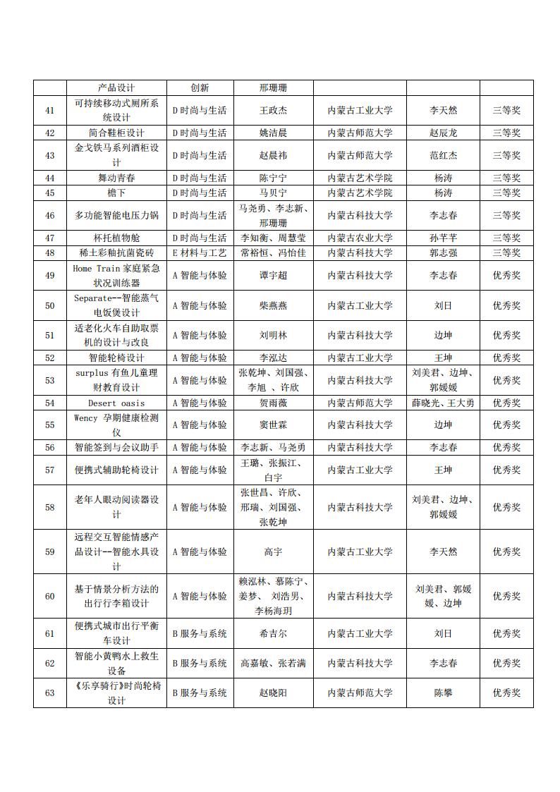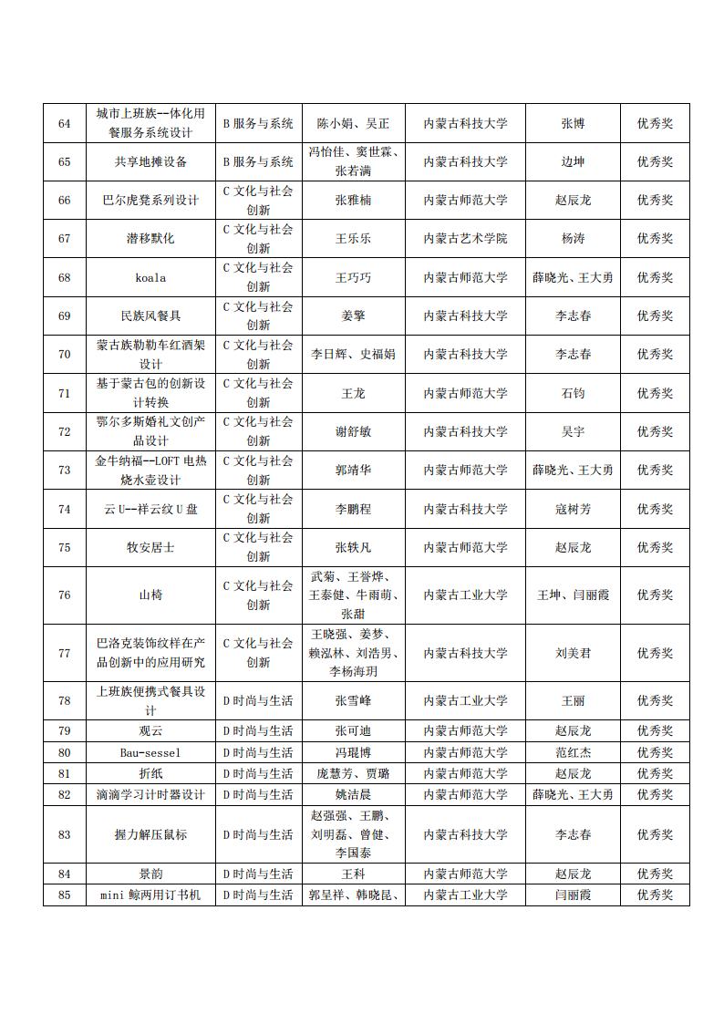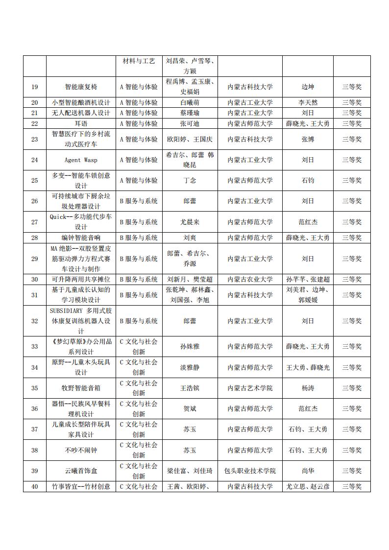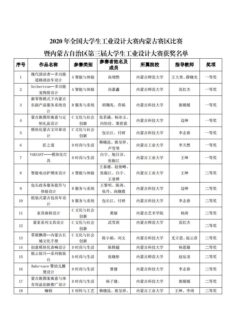 按照《關(guān)于舉辦2020 年全國大學(xué)生工業(yè)設(shè)計大賽內(nèi)蒙古賽區(qū)比賽暨內(nèi)蒙古自治區(qū)第三屆大學(xué)生工業(yè)設(shè)計大賽的通知》(內(nèi)教高函﹝2020﹞33號)要求,經(jīng)網(wǎng)上申報和專家評審,共評出一等獎7個、二等獎11個、三等獎30個、優(yōu)秀獎40個,現(xiàn)將獲獎名單進(jìn)行公示,公示期為2020年8月3日-8月7日,公示期間如有異議,請與我廳高等教育處聯(lián)系。聯(lián)系人:徐劼,電話:0471-2856606。 內(nèi)蒙古自治區(qū)教育廳 2020年7月30日
