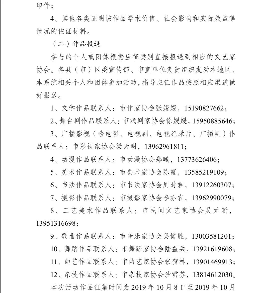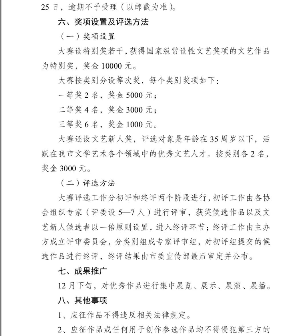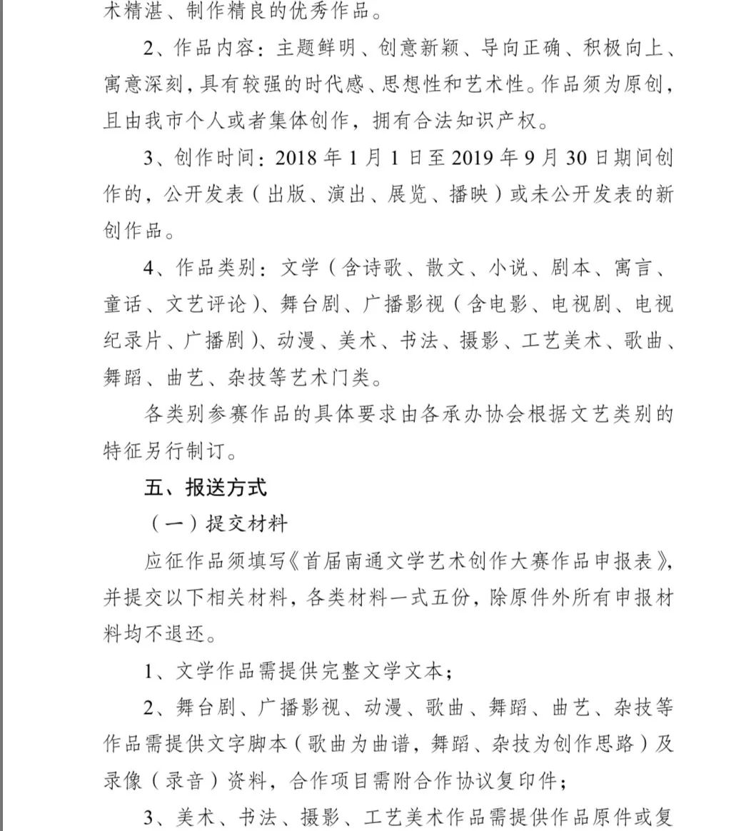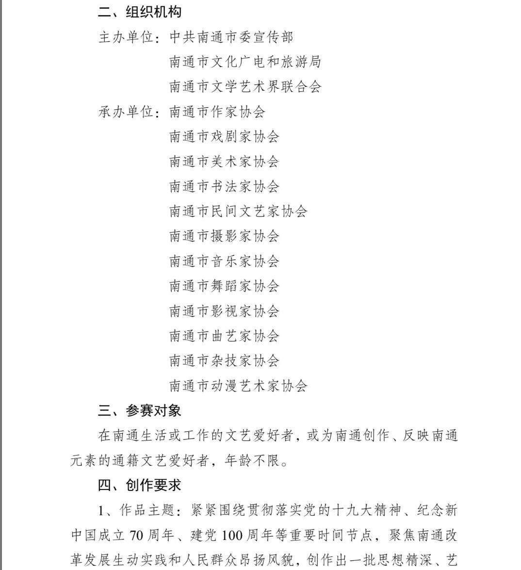 2、獎項設置和評選方法按照市委宣傳部通委宣[2019]42號《關于舉辦首屆南通文學藝術創(chuàng)作大賽的通知》文件精神進行。