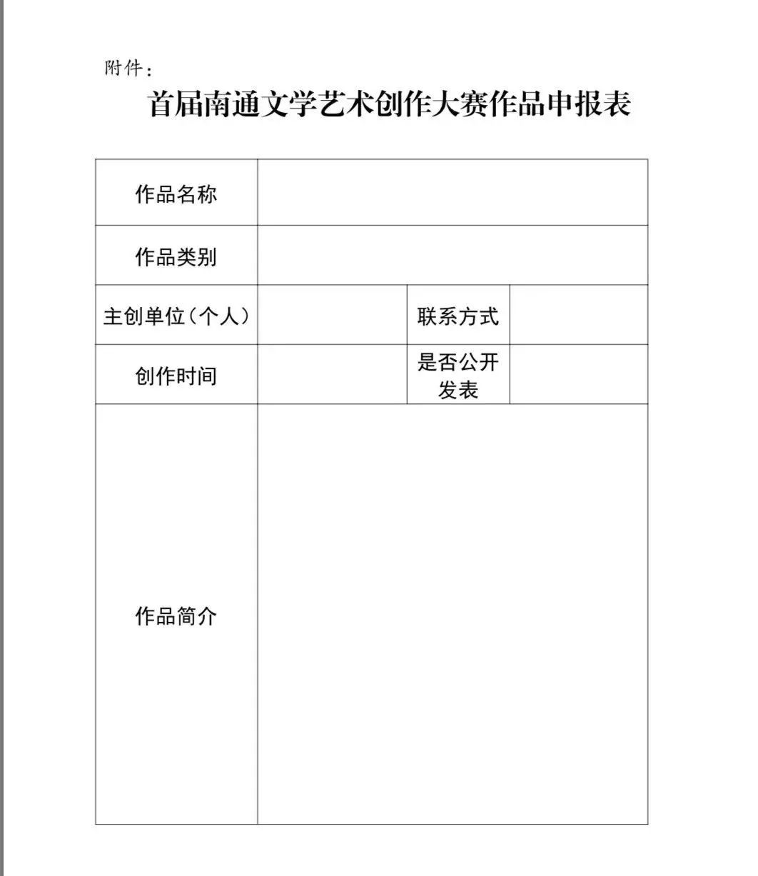 3、所有作品須填寫《首屆南通文學藝術創(chuàng)作大賽作品申報表》,提供作品的創(chuàng)意、主題闡述及內容簡介,并提供作品的DVD數據光盤或U盤,一式五份。(所有文字材料、光盤和U盤不再退回)。