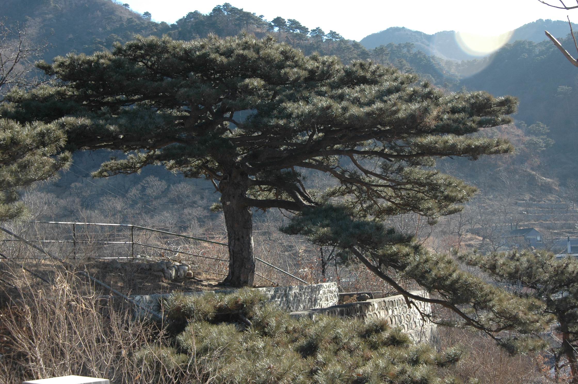 鴛鴦松,沿上行道過(guò)山澗虹橋,前行約100米,拐彎處路北側(cè)的松樹(shù)便是。此樹(shù)主干距地面約1米,分出南北各一支權(quán)。向南的支杈較粗壯挺拔,針葉長(zhǎng)而疏,為“馬尾松”,向北的支杈彎曲,針葉短而簇,為“油松”。同一樹(shù)干長(zhǎng)出截然不同種屬的兩個(gè)樹(shù)冠,似一對(duì)情侶相互依偎,因而被稱為“鴛鴦松”。
