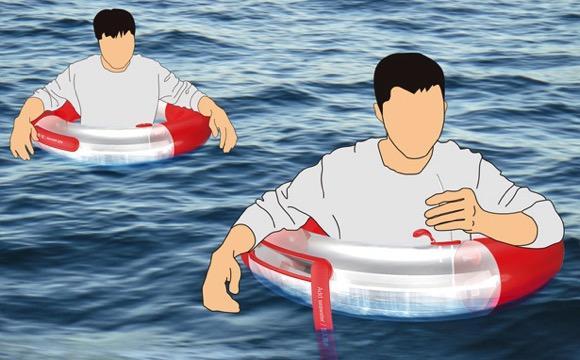 如遇海難,在茫茫大海中漂泊最痛苦的不過于對救援與生存的絕望。這款救生圈被分成了至少上下兩層,并有一段是透明的,人們可以利用陽光來對灌入救生圈內(nèi)的部分海水進行蒸餾,并將淡化后的水導(dǎo)入到底層冷凝,再通過吸管飲用。當(dāng)暫時無人營救時,還能勉強活下去。