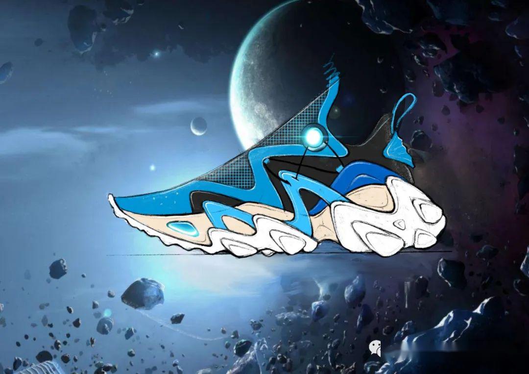 關(guān)于鞋身的圖案,也是基于我這次比賽作品的名稱破曉來設(shè)計(jì)的,我希望表達(dá)的是CUBA球員像是一顆顆中國(guó)籃壇冉冉升起的朝陽,鞋身的插色立體紋路以及后跟TPU紋路代表著破曉的陽光。關(guān)于鞋身的可拆卸鞋套,我也是基于一些可玩性的考慮,以球員出場(chǎng)褲為靈感,在鞋頭以及中底兩側(cè)加入搭扣設(shè)計(jì),使之成為一個(gè)可拆卸的鞋套,遮住鞋身具有運(yùn)動(dòng)感的線條,使球鞋更易于搭配,讓球員在場(chǎng)下也可以穿著。
