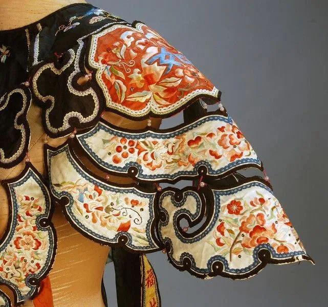 一件精美的披肩需要很長(zhǎng)時(shí)間才能繡成,刺繡工藝有片繡、珠繡、盤金、串珠、打籽繡等。 云肩的款式和材料也能突顯穿著者的個(gè)性和地位,比如慈禧太后的云肩就由3500顆珍珠串聯(lián)而成,發(fā)出云霞燦爛的魅力。