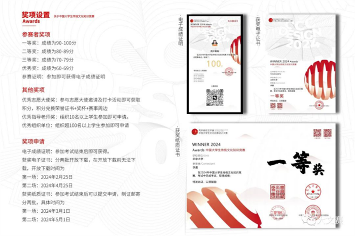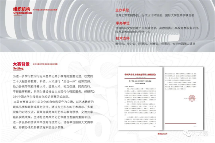 本屆大賽除中國(guó)大學(xué)生文化創(chuàng)意設(shè)計(jì)大賽命題賽道及非命題賽道外,另增設(shè)2024中國(guó)大學(xué)生傳統(tǒng)文化知識(shí)競(jìng)賽賽道。旨在進(jìn)一步推動(dòng)兩岸高校藝術(shù)教育及中國(guó)傳統(tǒng)文化交流發(fā)展,促進(jìn)兩岸設(shè)計(jì)學(xué)科師生交流合作,強(qiáng)化藝術(shù)與設(shè)計(jì)學(xué)科師生專業(yè)化素質(zhì),弘揚(yáng)中華優(yōu)秀傳統(tǒng)文化。