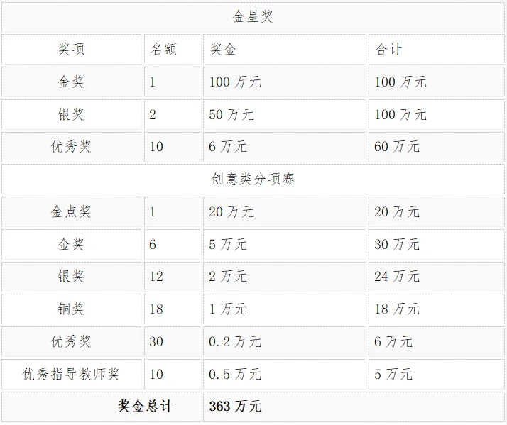 1.大賽設金星獎金獎1項、銀獎2項、優(yōu)秀獎10項;創(chuàng)意類金點獎1項、金獎6項、銀獎12項,銅獎18項,優(yōu)秀獎30項,入圍獎若干,優(yōu)秀指導教師獎10項。