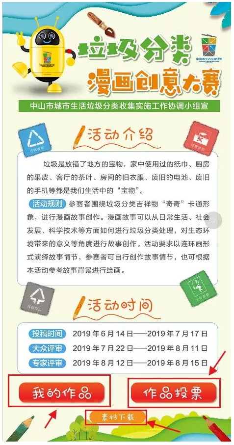 關(guān)注“家在中山”微信(微信號(hào)jzzs0760)——點(diǎn)擊菜單欄“福利活動(dòng)”——點(diǎn)擊“垃圾分類漫畫(huà)創(chuàng)意大賽”——按要求填寫(xiě)相關(guān)資料及上傳作品,(參詳請(qǐng)留意“家在中山”微信公眾號(hào)信息發(fā)布)。