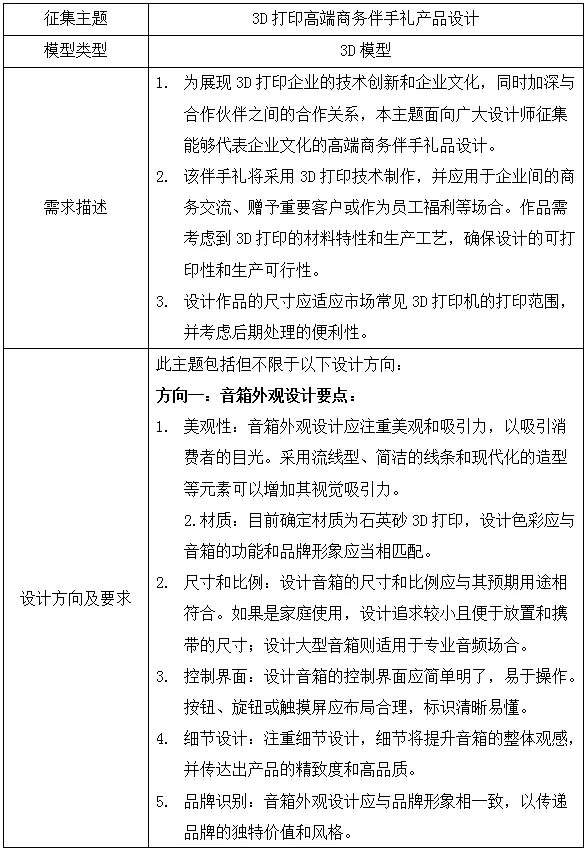 為了持續(xù)推動(dòng)創(chuàng)意設(shè)計(jì)與實(shí)體經(jīng)濟(jì)融合發(fā)展,以“3D打印+創(chuàng)意設(shè)計(jì)”為理念,挖掘3D打印技術(shù)的應(yīng)用潛力,助推創(chuàng)意設(shè)計(jì)賦能高質(zhì)量發(fā)展,打造增材制造新質(zhì)生產(chǎn)力,經(jīng)安徽省工業(yè)和信息化廳批準(zhǔn),在安徽省工業(yè)設(shè)計(jì)產(chǎn)業(yè)聯(lián)盟、蕪湖市經(jīng)濟(jì)和信息化局、繁昌區(qū)人民政府的指導(dǎo)下,安徽增材云數(shù)字科技有限公司聯(lián)合安徽省春谷3D打印智能裝備產(chǎn)業(yè)技術(shù)研究院有限公司共同主辦第三屆“增材云杯”3D打印設(shè)計(jì)獎(jiǎng)(以下簡(jiǎn)稱設(shè)計(jì)獎(jiǎng)),公開(kāi)發(fā)布產(chǎn)品設(shè)計(jì)需求榜單,面向全社會(huì)征集創(chuàng)意設(shè)計(jì)作品。
