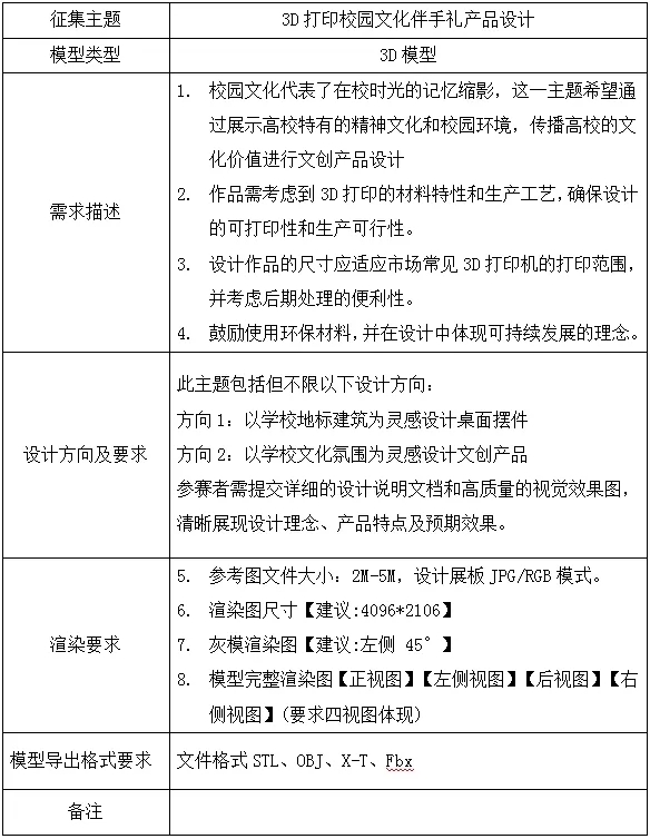 參賽者選取自己所熟悉的1—2所高校為研究對(duì)象,通過(guò)展示校園地標(biāo)建筑、校園文化特色,進(jìn)行校園文創(chuàng)伴手禮設(shè)計(jì),作品需考慮到3D打印的材料特性和生產(chǎn)工藝,確保設(shè)計(jì)的功能性、落地性,包括但不限于以下設(shè)計(jì)方向: