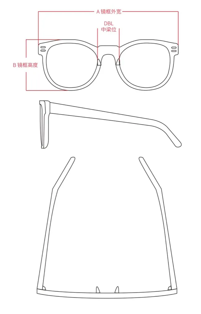 1.鏡架/太陽鏡設計圖紙上要按方框法標注基本尺寸:包括A位、B位、DBL中梁位、腳絲長度及其它重要的設計參數(shù)。