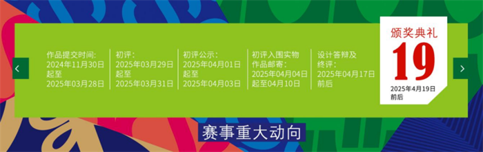 (四)大賽作品提交截止時(shí)間調(diào)整優(yōu)化為2025年3月28日;初評及公示時(shí)間調(diào)整為2025年3月29日至2025年4月3日;初評入圍實(shí)物作品郵寄調(diào)整為2025年4月4日至4月10日;終評答辯調(diào)整為2025年4月17日前后;活動(dòng)大賽頒獎(jiǎng)時(shí)間調(diào)整為2025年4月19日前后。終評及頒獎(jiǎng)準(zhǔn)確時(shí)間另行通知。