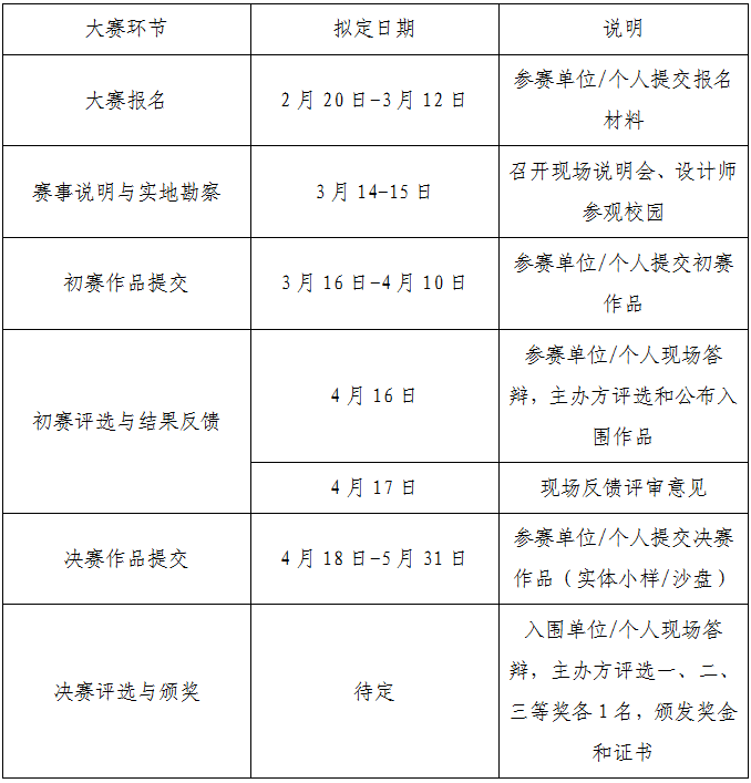入圍單位/個(gè)人需于現(xiàn)場(chǎng)交流會(huì)后深化和修改設(shè)計(jì)方案,并制作和提交決賽作品,包括更新后的設(shè)計(jì)稿、設(shè)計(jì)方案以及作品的實(shí)體小樣/沙盤(pán),決賽作品提交截止日期暫定為2025年5月31日,具體提交要求和時(shí)間另行通知。大賽組委會(huì)將向所有入圍決賽并提交決賽作品的單位/個(gè)人提供2萬(wàn)元小樣制作費(fèi)用。