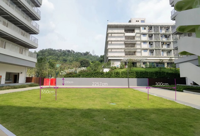 (三)作品設(shè)立位置計(jì)劃為深圳理工大學(xué)主校區(qū)天權(quán)4號(hào)樓書(shū)院中庭,擺放位置、安裝方式不限,但原則上應(yīng)坐落在書(shū)院中庭范圍內(nèi)。參賽者可根據(jù)作品需要對(duì)現(xiàn)場(chǎng)環(huán)境進(jìn)行適當(dāng)改造(例如,拆除或填補(bǔ)現(xiàn)有墻體和兩邊圍擋)。作品擬設(shè)立場(chǎng)地實(shí)景見(jiàn)下圖。因拍攝角度問(wèn)題,圖中標(biāo)注尺寸可能存在誤差。