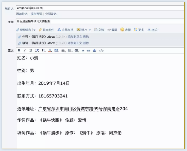(2)郵件標(biāo)題為“第五屆金蝸牛填詞大賽報名”,投稿須附帶姓名、性別、出生年月、聯(lián)系方式、通訊地址等基本信息;