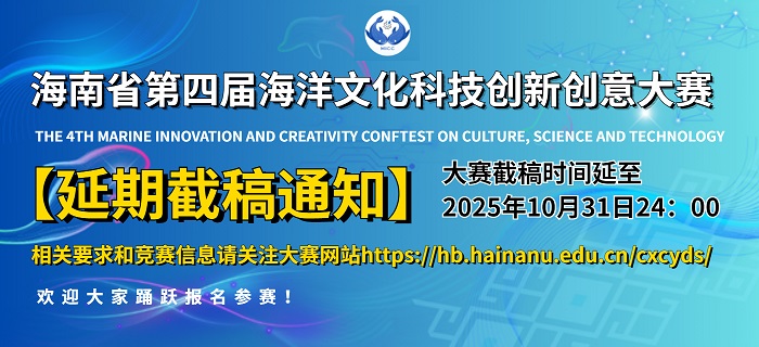 海南省第四屆海洋文化科技創(chuàng)新創(chuàng)意大賽于2025年7月17日正式開啟報名通道,大賽啟動以來受到了全國相關(guān)專業(yè)高校師生的廣泛關(guān)注和踴躍投稿。近期臨近大賽截稿,參賽系統(tǒng)平臺出現(xiàn)大量參賽人員同時間提交參賽作品,導(dǎo)致網(wǎng)站平臺堵塞,較多參賽者反映無法成功上傳作品。為了征集更多優(yōu)質(zhì)稿件,給參賽者留出更充裕的創(chuàng)作和完善時間,賽出風格、賽出水平,經(jīng)大賽組委會研究決定,大賽截稿時間延至2025年10月31日24: 00。相關(guān)賽程安排相應(yīng)調(diào)整。