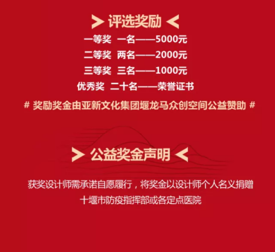 不限地域,不限年齡,不限職業(yè),畫面必須出現(xiàn)“龍馬十堰,文創(chuàng)戰(zhàn)疫”的大賽主題,通過多角度、多形式、多風(fēng)格的方式,反映疫情防控戰(zhàn)疫中的真善美,可以是單幅作品,也可以是系列作品(系列作品最高不超過4張),但需要是為本次十堰邀請賽原創(chuàng),作品可署名設(shè)計師姓名,以平面設(shè)計作品傳播知識,堅定信心,凝聚力量,溫暖人心。
