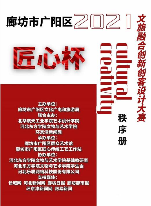 廣陽區(qū)“匠心杯”文旅融合創(chuàng)新創(chuàng)客設(shè)計大賽,由廣陽區(qū)文廣旅局、北華航天工業(yè)學(xué)院藝術(shù)設(shè)計學(xué)院、河北東方學(xué)院文物與藝術(shù)學(xué)院聯(lián)合舉辦,本次大賽旨在引導(dǎo)廣大青年學(xué)生和社會各界熱愛中國傳統(tǒng)文化,深入認識廊坊的歷史文化和風(fēng)土人情,以創(chuàng)新設(shè)計大賽為紐帶,培育新生代原創(chuàng)力量,引導(dǎo)創(chuàng)意設(shè)計貼近時代、融入生活、服務(wù)發(fā)展,為人民群眾提供全方位、生活化的文旅融合創(chuàng)意設(shè)計產(chǎn)品,更好的傳播社會主義核心價值觀,激發(fā)創(chuàng)新創(chuàng)造活力,豐富文旅產(chǎn)品供給,提升人民群眾生活品質(zhì),繁榮促進文旅消費,推進文旅產(chǎn)業(yè)高質(zhì)量發(fā)展,更好地將知識、技能轉(zhuǎn)化為振興活力廣陽的動力源泉。