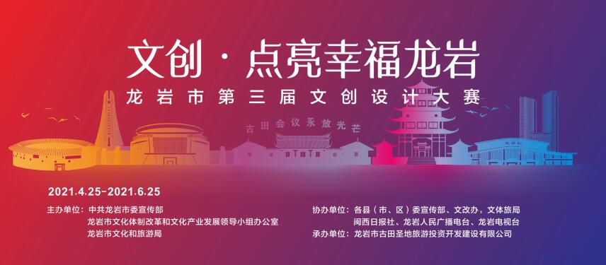 以大賽為紐帶,匯聚優(yōu)秀文化創(chuàng)意設計人才,深入挖掘龍巖特色文化資源,弘揚優(yōu)秀傳統(tǒng)文化,堅定文化自信;提高文化創(chuàng)意設計水平,推出一批理念新穎、內涵深刻、特色鮮明、競爭力強的文化創(chuàng)意作品;搭建文化創(chuàng)意產品成果轉化平臺,為文化創(chuàng)意產品尋求市場空間,推動龍巖文化創(chuàng)意產業(yè)快速發(fā)展,提升文化旅游融合高質量發(fā)展,向建黨100周年獻禮。