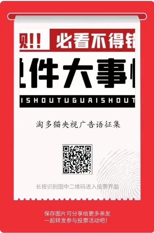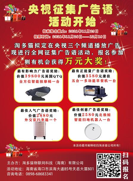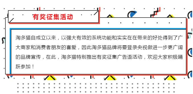 淘多貓擬定在央視三個頻道播放廣告,現(xiàn)進行全網(wǎng)廣告語征集活動,報名參加,則有機會獲得萬元大獎!