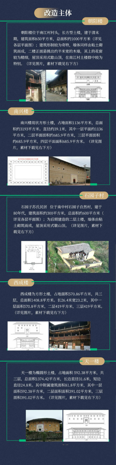 (1)任選一棟土樓為改造主體,設(shè)計需保留原有房屋主體構(gòu)造,通過外立面改造、室內(nèi)設(shè)計、周邊環(huán)境的營造,將土樓原有文化基因以不同風格的改造設(shè)計凸顯出來。