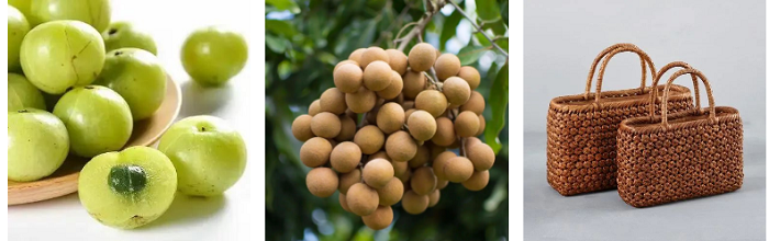 從左至右:大玉余甘果、石硤龍眼、竹木藤芒草編織品