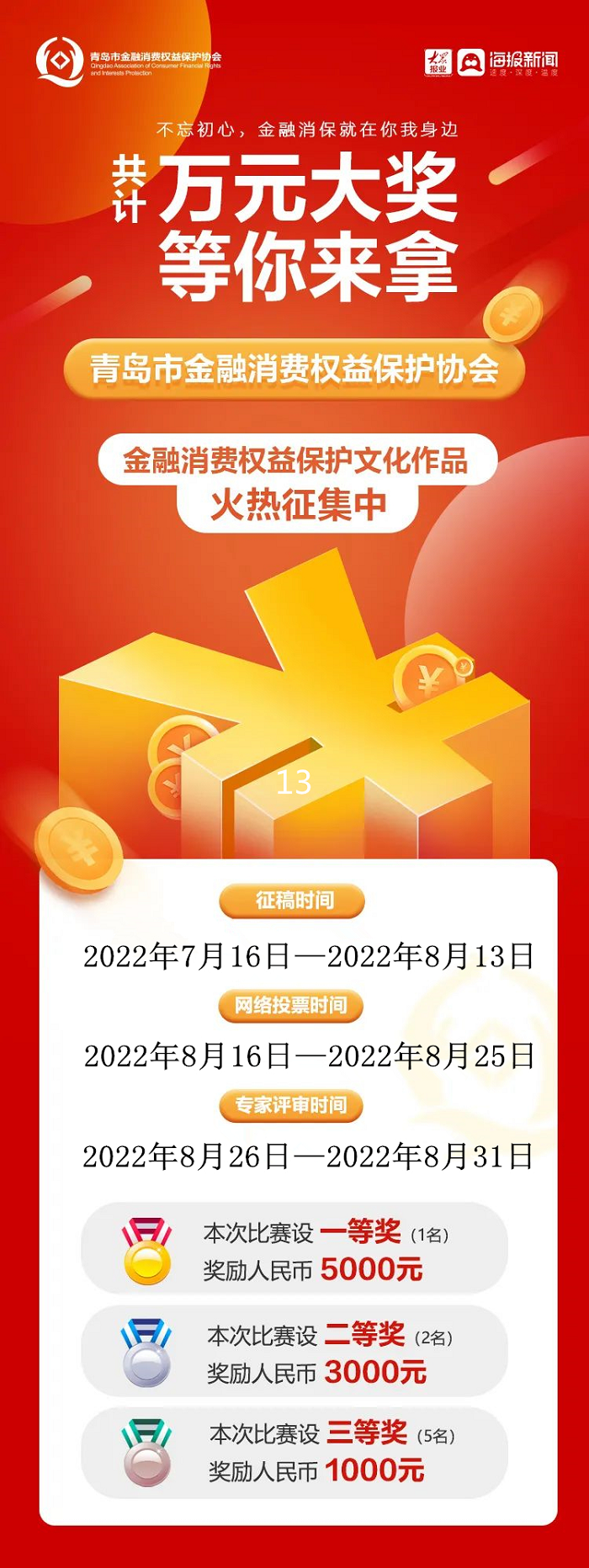 作品收齊后,青島市金融消費權(quán)益保護協(xié)會將聯(lián)合大眾網(wǎng)青島組織網(wǎng)絡投票(大眾網(wǎng)青島微信公眾號)。網(wǎng)絡投票結(jié)束后,將組織專家進行評選,綜合成績評選出一、二、三等獎。