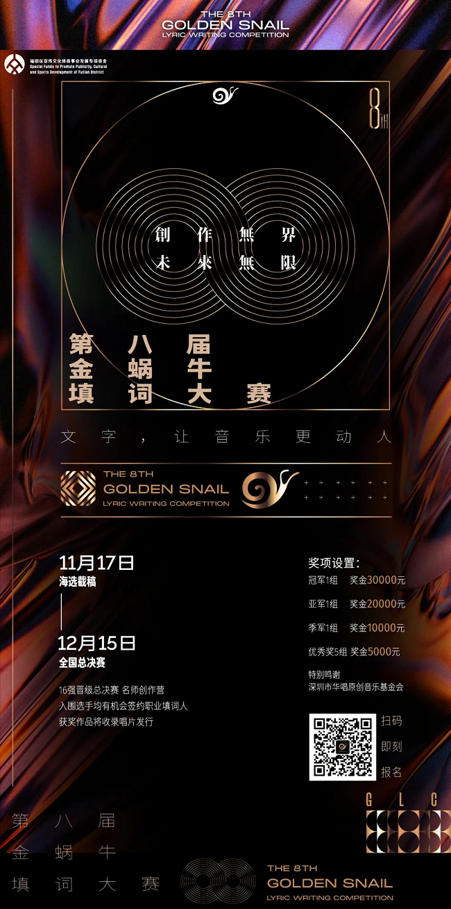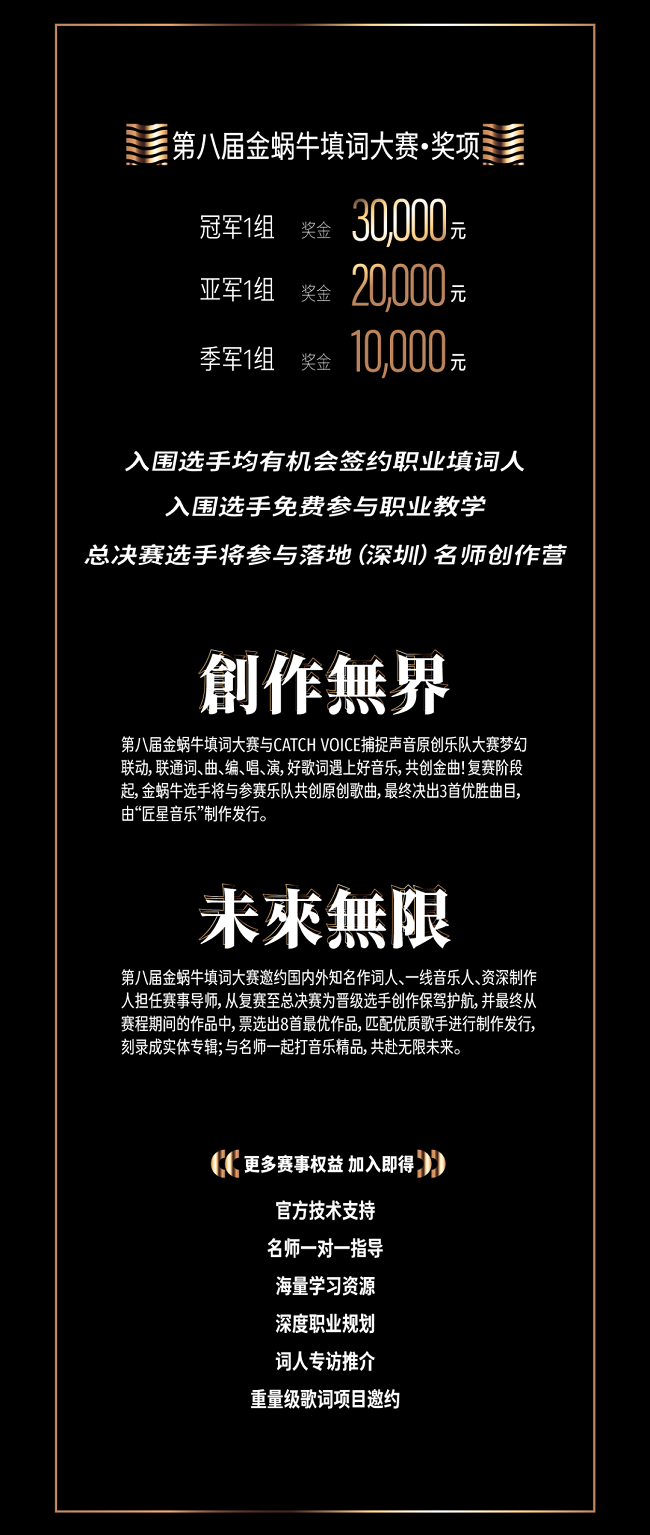 3、參與第八屆金蝸牛填詞大賽的作品,在比賽期間直至大賽結(jié)束后90天內(nèi),作品不得以任何形式發(fā)布到其他任何網(wǎng)絡(luò)音樂平臺(tái),大賽主辦方保留此期間內(nèi)所有參賽作品的相應(yīng)版權(quán)及各項(xiàng)權(quán)益。