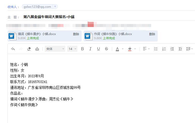 ① 郵件標(biāo)題:“第八屆金蝸牛填詞大賽報(bào)名-作者名”