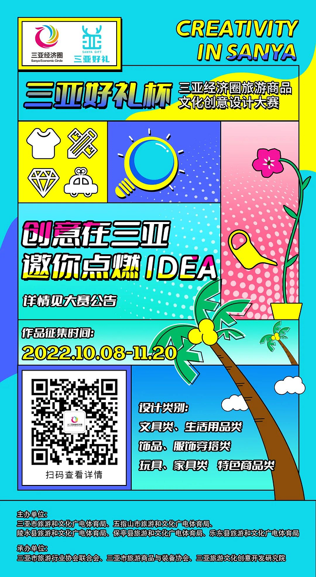 為進(jìn)一步擴(kuò)大三亞經(jīng)濟(jì)圈旅游產(chǎn)業(yè)集群的輻射和影響作用,結(jié)合海南自貿(mào)港“打造國際設(shè)計(jì)島”建設(shè)要求,以整合三亞經(jīng)濟(jì)圈各市縣旅游文化資源、開發(fā)旅游文化商品、促進(jìn)區(qū)域旅游合作及經(jīng)濟(jì)增長為目的,三亞市、五指山市、陵水縣、保亭縣、樂東縣旅游和文化廣電體育局將舉辦2022首屆“三亞好禮杯”三亞經(jīng)濟(jì)圈旅游文化商品創(chuàng)意設(shè)計(jì)大賽。現(xiàn)面向社會(huì)廣泛征集和評(píng)選具有三亞經(jīng)濟(jì)圈特色的旅游文化創(chuàng)意商品。