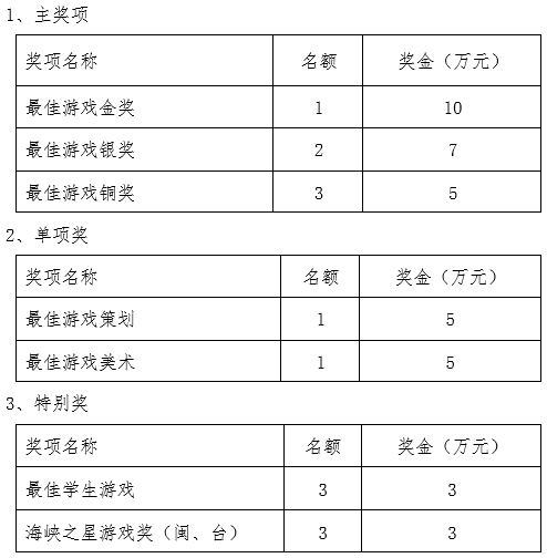 (4)獎項(xiàng)將在所有參賽作品中選出,其中最佳學(xué)生游戲由學(xué)生參賽作品中選出;海峽之星游戲獎由福建省和臺灣省參賽作品中選出。