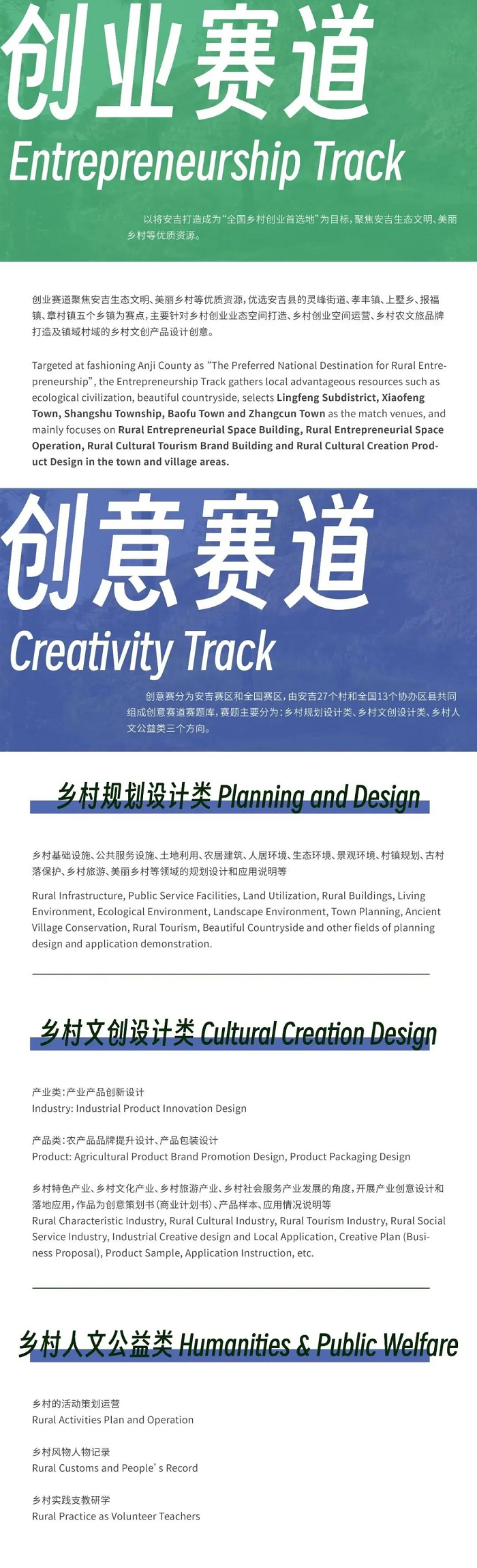 創(chuàng)意賽道分為安吉賽區(qū)和全國賽區(qū)。安吉賽區(qū)由安吉全域15個鄉(xiāng)鎮(zhèn)(街道)優(yōu)選的27個村組成,全國賽區(qū)由13個協(xié)辦區(qū)縣20個村組成。從「鄉(xiāng)村規(guī)劃」、「鄉(xiāng)村文創(chuàng)」和「人文公益」三個方面對鄉(xiāng)村基礎設施、公共空間環(huán)境提升,鄉(xiāng)村文化的在地生長等方向開展創(chuàng)意設計并落地執(zhí)行。