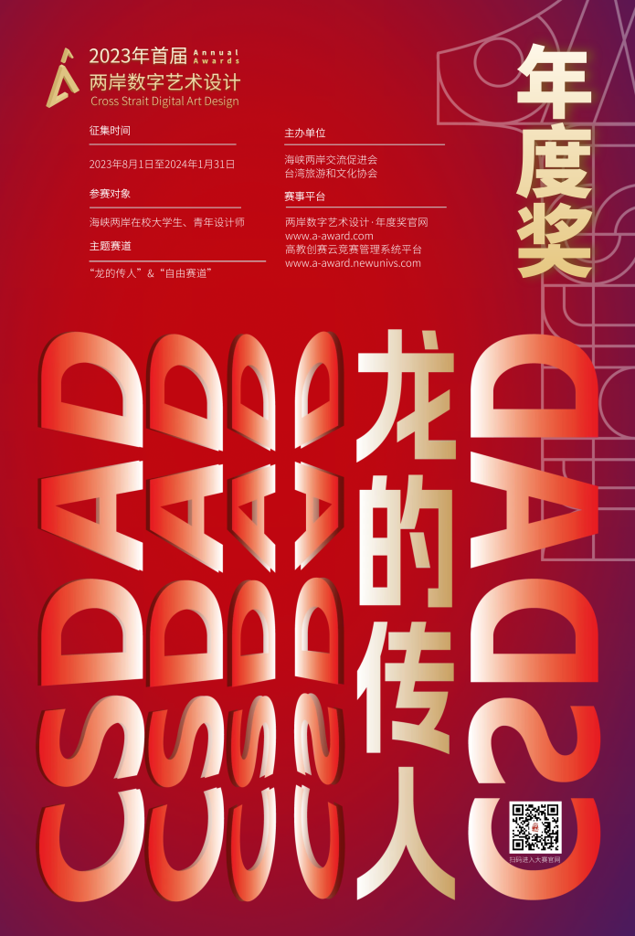為貫徹落實黨中央、國務(wù)院工作部署激發(fā)兩岸青年互學(xué)互鑒,促進兩岸同胞心靈契合。在海峽兩岸交流促進會、臺灣旅游和文化協(xié)會牽頭,亞太青年設(shè)計師協(xié)會、臺灣國際文化創(chuàng)意產(chǎn)業(yè)發(fā)展協(xié)會、廣東非物質(zhì)文化遺產(chǎn)基金會、高教創(chuàng)賽云競賽服務(wù)平臺及兩岸文創(chuàng)單位和多所大學(xué)的師生支持下,將于2023年8月1日舉辦2023首屆兩岸數(shù)字藝術(shù)設(shè)計年度獎,現(xiàn)將大賽大綱公布如下: