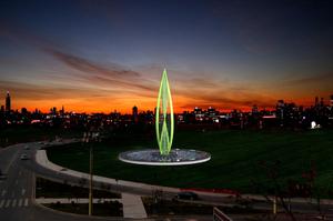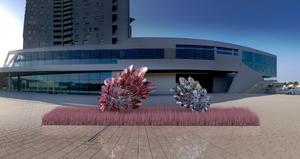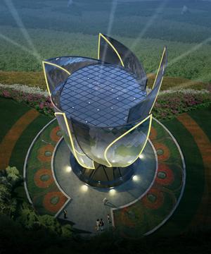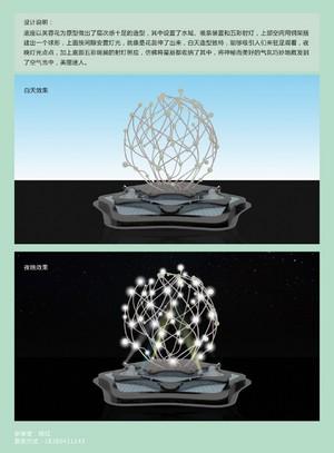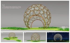 【設(shè)計(jì)思路】底座以芙蓉花為原型做出了層次感十足的造型,其中設(shè)置了水域、噴泉裝置和五彩射燈,上部空間用鋼架搭 建出一個(gè)球形,上面按間隙安置燈光,就像是花蕊伸了出來(lái)。白天造型獨(dú)特,夜晚燈光點(diǎn)點(diǎn),加上底部五彩斑斕的射燈照應(yīng),仿佛將星辰都收納其中,將神秘而美好的氣氛巧妙地散發(fā)到 了空氣當(dāng)中,美麗迷人。